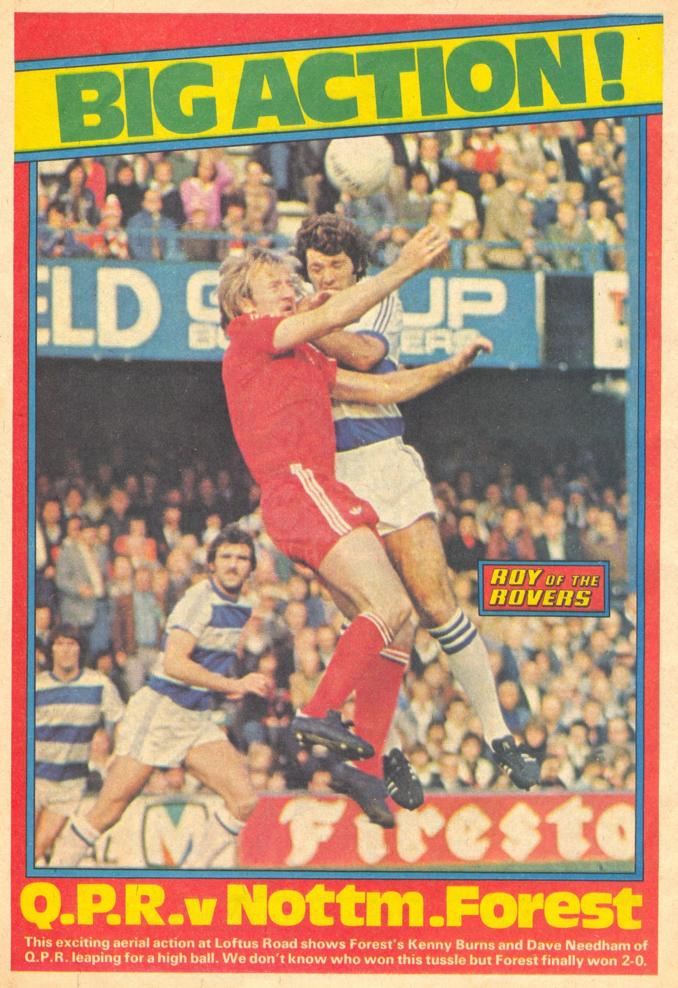 ‘Roy of the Rovers’ has previously been featured four times so far in this series and this edition is dated 17th December 1977. QPR v Nottm. Forest was the ‘Big Action’ on the back page and the caption reads: ‘This exciting aerial action at Loftus Road shows Forest’s Kenny Burns and Dave Needham of QPR leaping for a high ball. We don’t know who won this tussle but Forest finally won 2-0’.