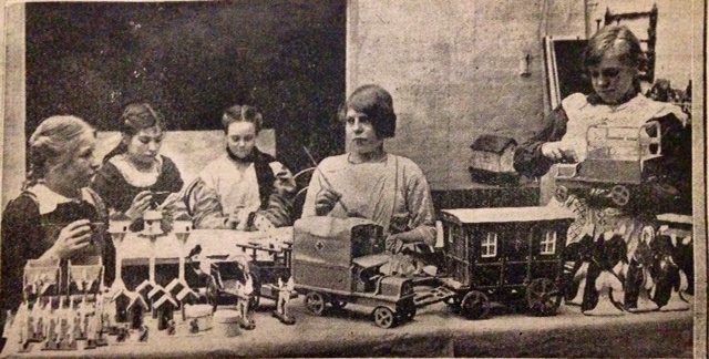 The picture gives some idea of what will be seen there. The girls who are learning toy-making in a garden work-room at 67, Lancaster Road, W., are putting the finishing touches to some of the many splendid playthings they have made’.