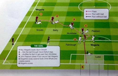 ‘ Collecting the ball on the right-hand flank, Wegerle jumped over Glynn Snodin’s sliding tackle, waited for David Batty to leap into a challenge before slipping the ball through his legs, beat Gary McAllister with a step-over, accelerated and prodded the ball forward to evade the diving John Pearson, jinked to wrong-foot Chris Whyte and drove a low shot just inside the post.’