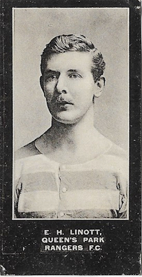 During 1908/09 F & J Smith issued a series of 50 football ‘Cup Tie’ cigarette cards and number 34 featured QPR’s England international, E. H. Lintott.
